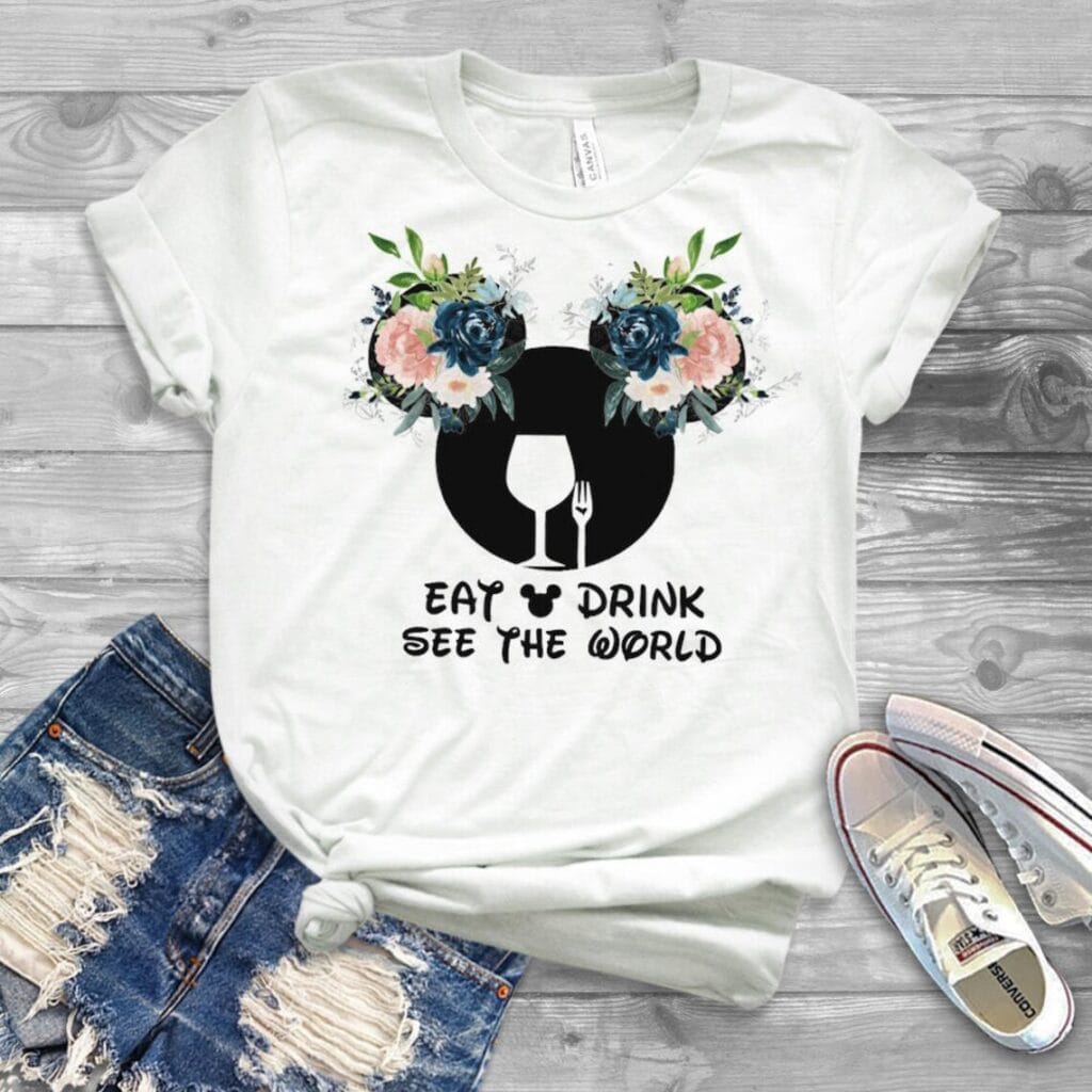 During EPCOT International Food & Wine Festival, you can eat, drink, and see the world. Enjoy tasty treats, delicious drinks, and wander through the World Showcase. Now, you can do all of that in style with this t-shirt from Mamapower on Etsy. The pink and blue floral design adds a touch of feminine style to this look.