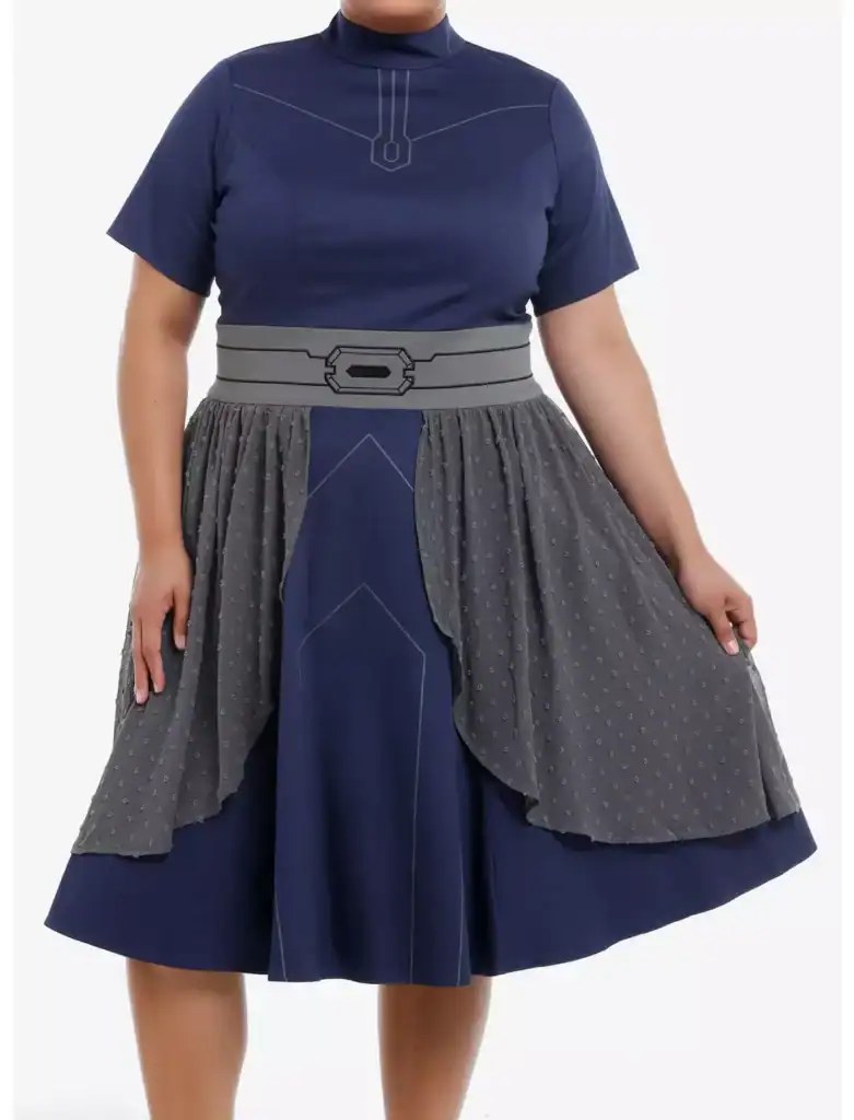 Be fierce like your favorite Force user! This Star Wars dress brings all the style of Ahsoka Tano with a little retro flair. Modeled after her blue outfit, this dress features her outfit markings printed on the chest and skirt, plus an embroidered faux belt design at the waist. It comes with a textured chiffon layer over the skirt, side seam pockets, a mock neck and back zipper.
