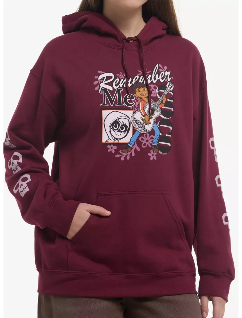 Pixar fans are not left out. The Coco hoodie features Miguel mid-performance, surrounded by colorful details and Día de los Muertos-inspired accents. The rich burgundy shade adds warmth and depth, making it feel a little dressier than your average graphic hoodie. It’s a lovely option for fans who want something expressive but still cozy.