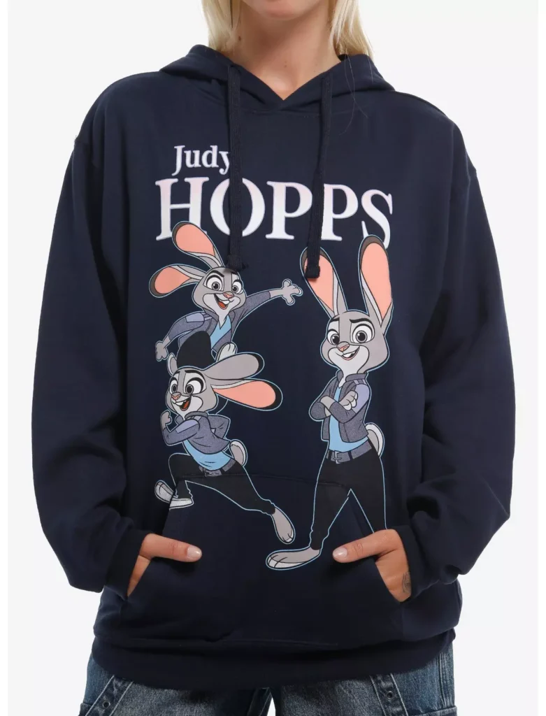 Another Zootopia favorite also gets the spotlight with a Judy Hopps hoodie. This design highlights her energetic personality in several action poses, making it a great pick for fans of the film’s optimistic bunny cop.