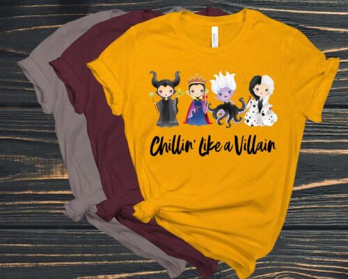 This shirt shows four of the classic female Disney Villains: Maleficent, The Evil Queen, Ursula, and Cruella de Vil and the words “Chillin Like a Villain”. Although they are all bad to the bone, the shirt has a way of making this evil crew look almost friendly, making this the perfect shirt for a Halloween party where you don’t want to scare the other partygoers. I can think of a few of my teacher friends who this shirt would be perfect for!!