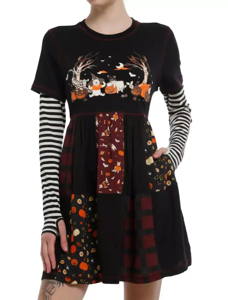 This dress is pure Halloween joy! With a whimsical scene of Pooh, Piglet, Tigger, and Eeyore dancing among jack-o’-lanterns on the bodice and a patchwork skirt full of pumpkins, candy corn, and cozy fall prints, it’s equal parts cute and creepy (in the best way). Black-and-white striped long sleeves are built in for that effortless layered look, so you’re fall-ready in seconds.