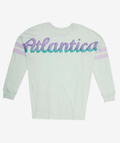 Look at this jersey, isn’t it neat? Ariel’s home kingdom is represented on this seafoam green hype jersey. It features a puffy and sparkly “Atlantica” graphic across the back, and also a silhouette of Ariel sitting on a rock on the chest. We’ll be sparkling like mermaids for sure in this jersey!