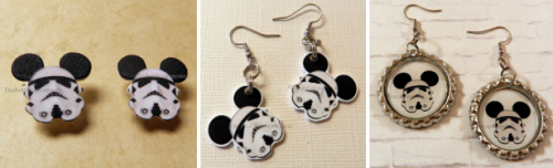 There are Stormtrooper-Inspired Mouse Head Post Earrings, Stormtrooper-Inspired Mouse Head Dangle Earrings, and Stormtrooper-Inspired Mouse Ears Bottle Cap Earrings.