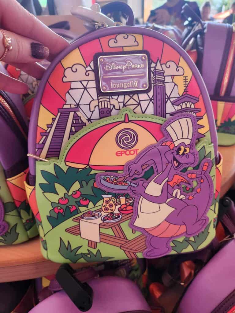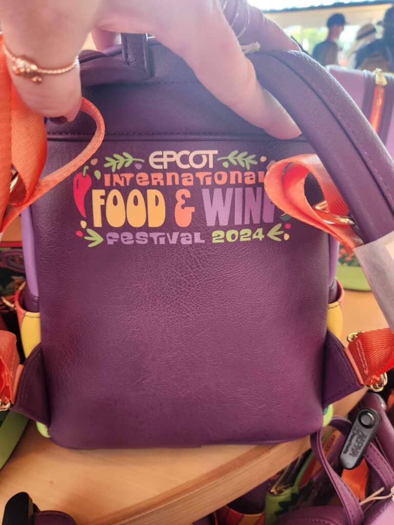 The official Food and Wine Loungefly is a veritable party on a bag. Join Figment as he dons his apron and chef’s hat to cater a healthy lunch for friends. On this 90 degree day, I’d happily sip some of that lemonade! With the bright starbursts of orange and yellow upon the purple bag, the colors feed your hungry eyes. You can find the same foliage and burst of color on the side pocket, along with the festival title on the rear of the bag.
