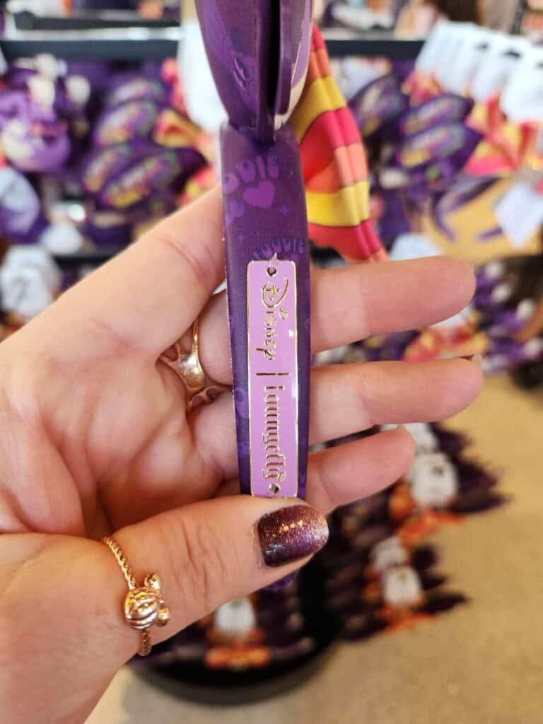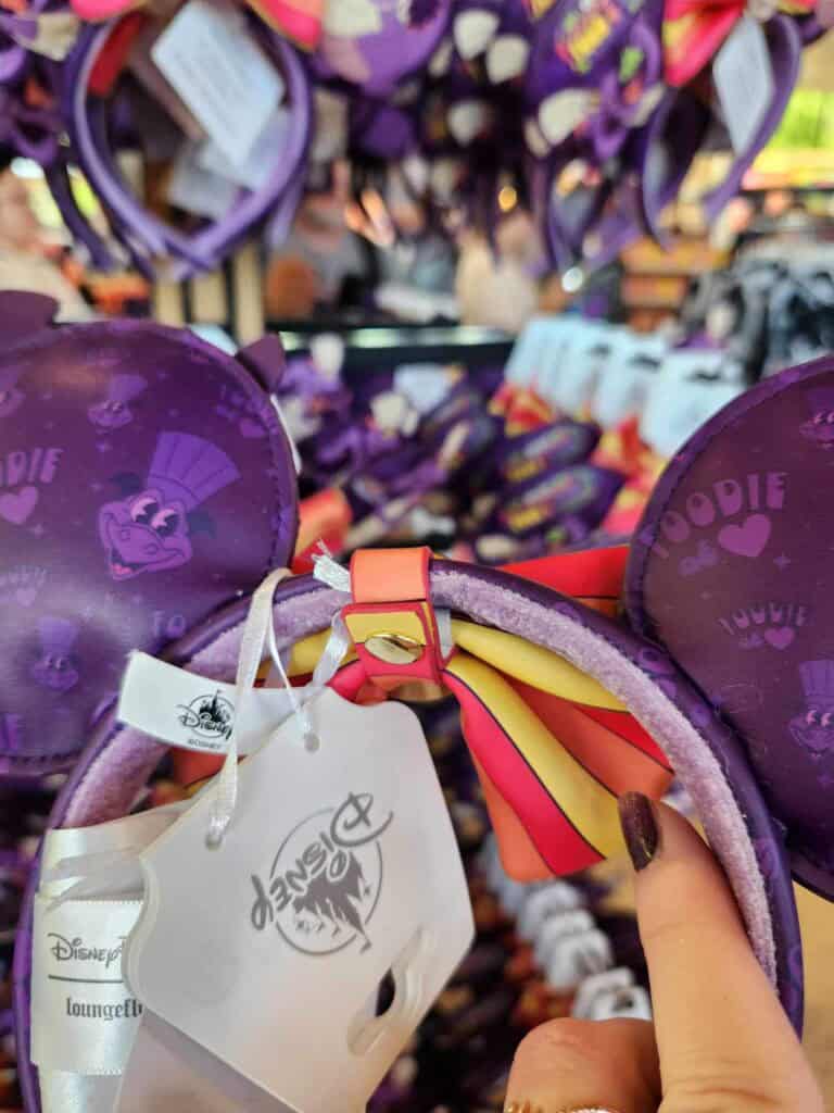 Loungefly also artfully designed matching ears to the backpack. The ears and headband feature a light purple design on darker background highlighting Figment, hearts and “foodie.” Additionally, each ear boasts an applique of the dragon again preparing food and laying back to nosh on some grapes. The removeable bow contrasts with red, orange and yellow rays centered in the middle with a charm.