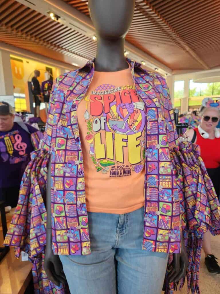 As you’ve learned by now the artwork of Figgy sautéing his veggies is a repeating theme in the merch. The dark purple spirit jersey offers this design on the back of the Spirit Jersey as well as an updated image of Spaceship Earth on the front. The bright colors continue on a short-sleeved tie-dye t-shirt. This design has such a retro throwback to it, and I’m here for it! The last apparel item in the Figment collection is the Spice of Life tee. Our culinary friend gives a proverbial chefs kiss to the statement “Imagination is the Spice of Life.” I truly love the juxtaposition of the purple with the melon color.