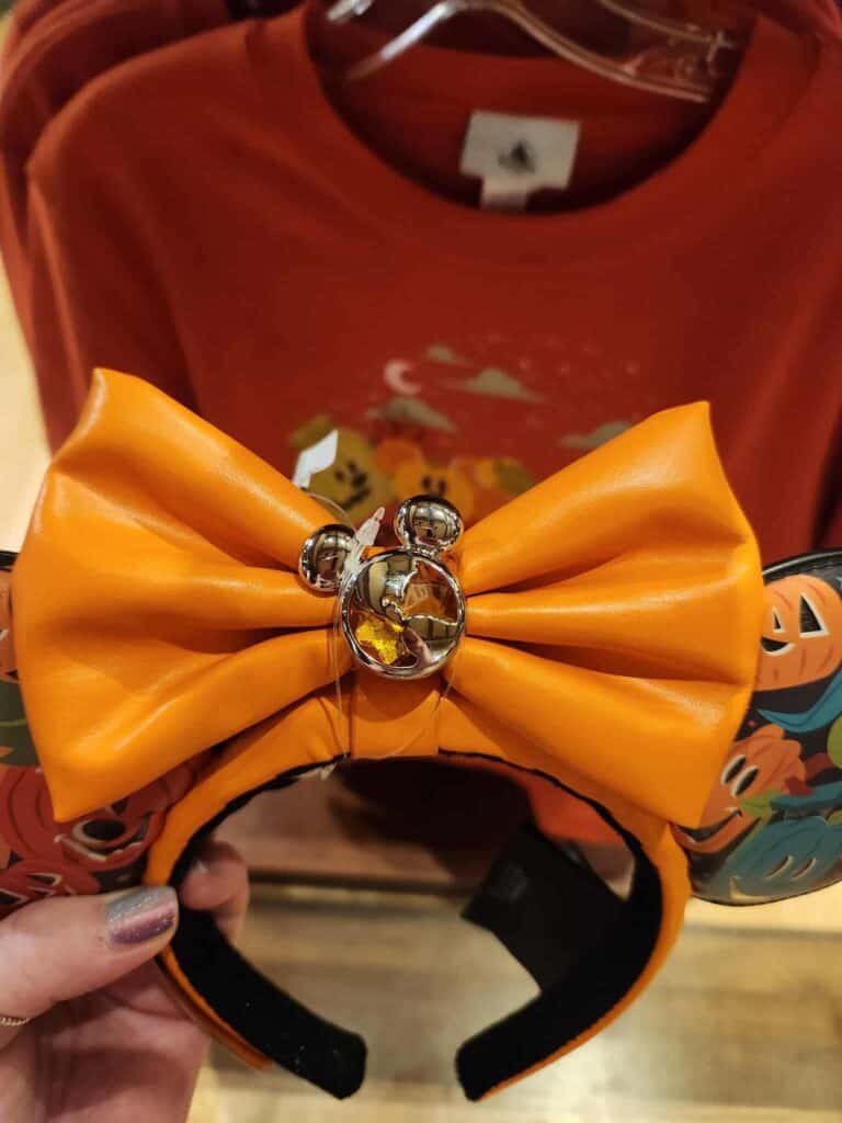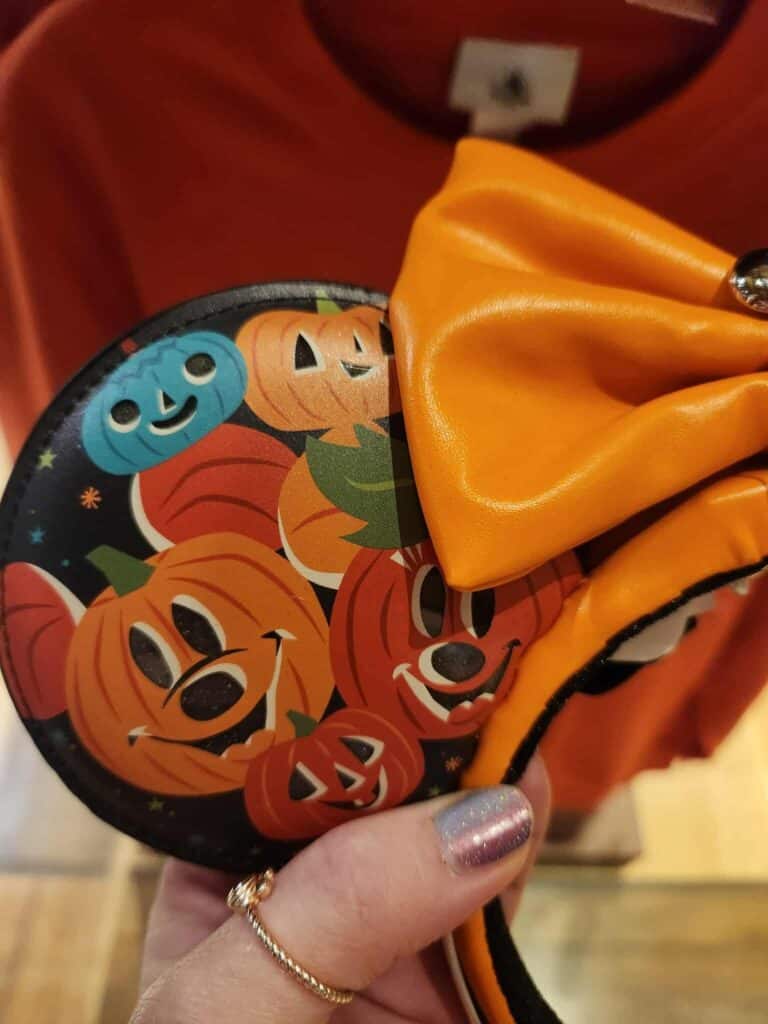 Give ’em pumpkin to talk about! These gourd-geous ears are perfect for the upcoming fall season. A Silver Mickey charm anchors the removable orange bow to the headband. Meanwhile, fun, colorful pumpkins shaped like your favorite Disney characters fill the ears against a black background. Stars and sparkles fill any empty space. How many characters do you count? Stars and sparkles fill the gaps for extra magic. How many characters can you spot?