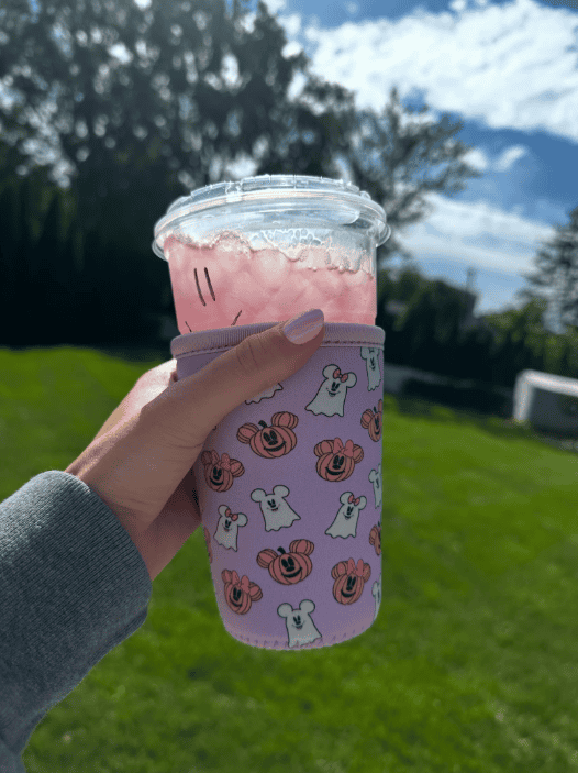 This reusable sleeve features some of our favorite frightfully cute designs. Mickey and Minnie pumpkins smile alongside ghostly pals, all set against a playful lavender background. The combination is both spooky and sweet, making it the perfect choice for iced coffee, tea, or even a refreshing pink lemonade. Whether you’re at the parks or just running errands, this sleeve adds instant Disney Halloween flair to your drink.