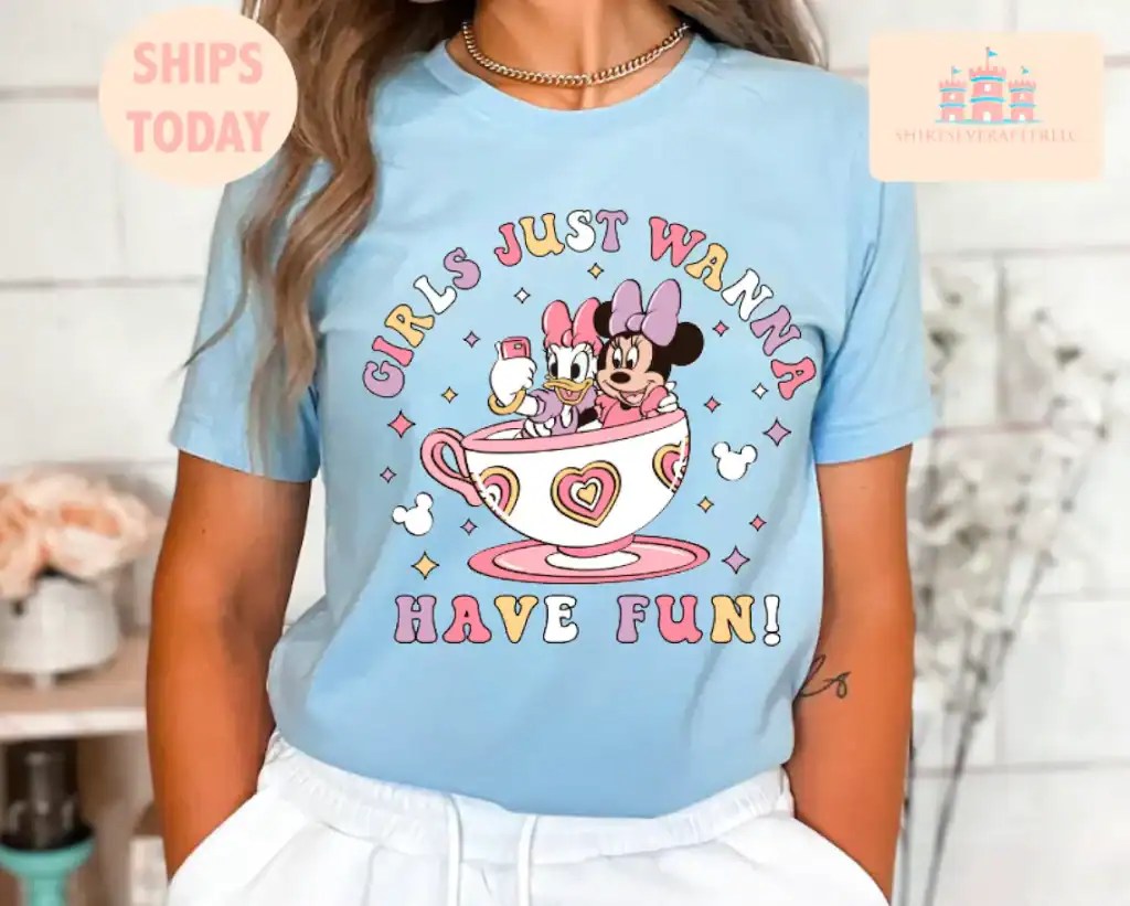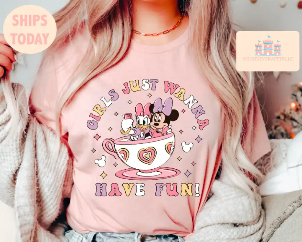 ShirtsEverAfterLLC en la plataforma Etsy nos trae esta adorable camiseta donde vemos a las mejores amigas Daisy y Minnie teniendo un día de parques. Sentadas en una taza de Alicia en el País de las Maravillas y haciéndose una selfie, rodeadas de la frase “Girls just wanna have fun” (Las chicas solo quieren divertirse). Disponible en varios colores.