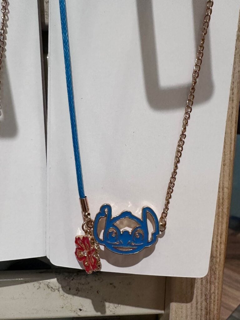 The first item in the collection is this Stitch necklace. It has a blue Stitch outline and a pretty magenta flower. I love that one side of the necklace is a rope while the other side has a small golden chain.