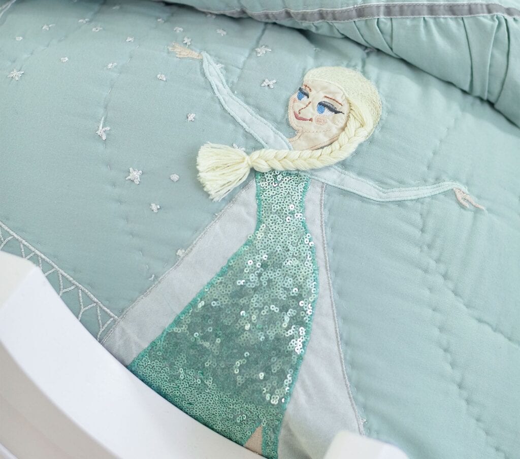 The cold definitely won’t bother you with this gorgeous Anna, Elsa, and Olaf quilt! The hand-stitched and reversible quilt features pretty details like sequins and handbraided hair on Anna and Elsa. Add the shams to complete the look and have a bed fit for a queen! The quilt is available in twin or full/queen.