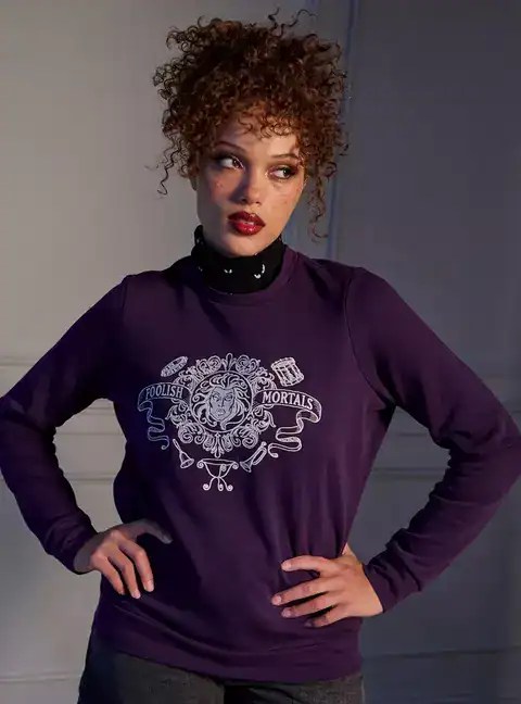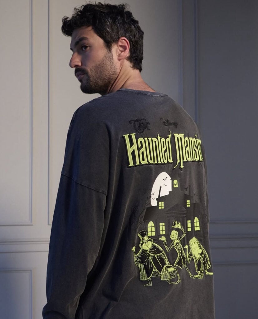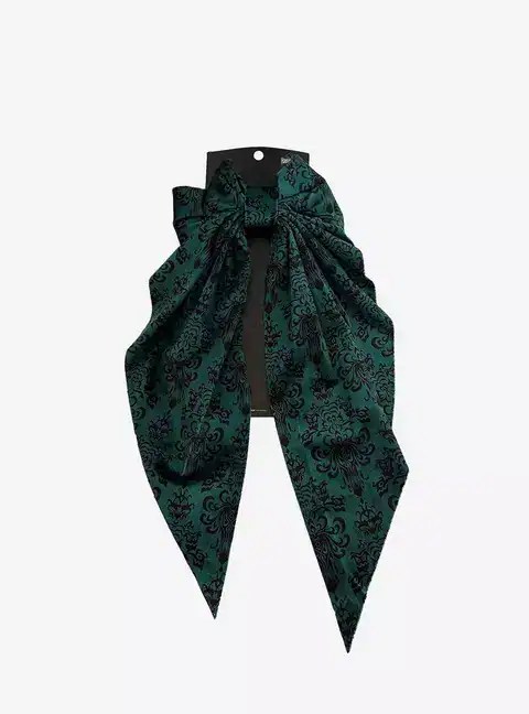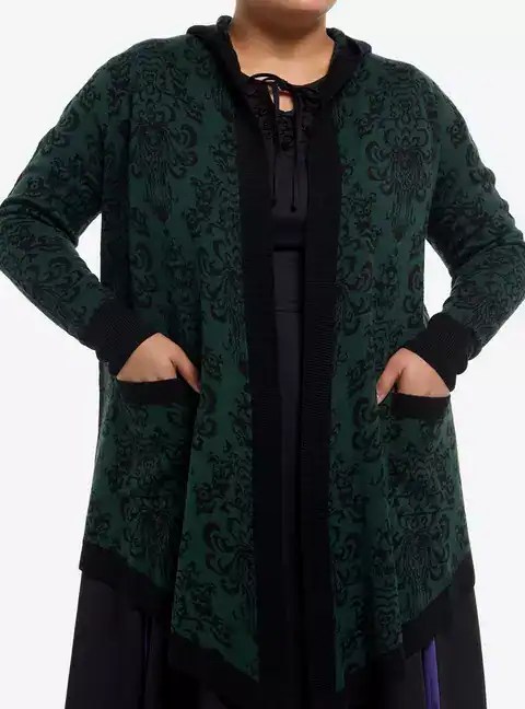 Channel your inner fortune teller with the Madame Leota turtleneck sweater. The deep purple hue is sure to summon spirits from the beyond, while glow-in-the-dark eyes on the black turtleneck add a hauntingly chic touch. As the chills creep in, drape yourself in the cardigan inspired by the iconic Haunted Mansion wallpaper. Featuring a rich green and black design, black trim, and a mysterious loose hood, it’s the perfect layer. Complete your spectral look with a matching velvet hair bow.