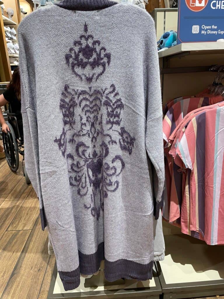 Want to show your love of Haunted Mansion in an understated way? This long knit cardigan is just the thing! Its gray color and oversized silhouette are great for cooler temperatures. The darker gray pattern of the infamous wallpaper on the front and back is a subtle nod to Magic Kingdom’s creepiest ride. It retails for $69.99.