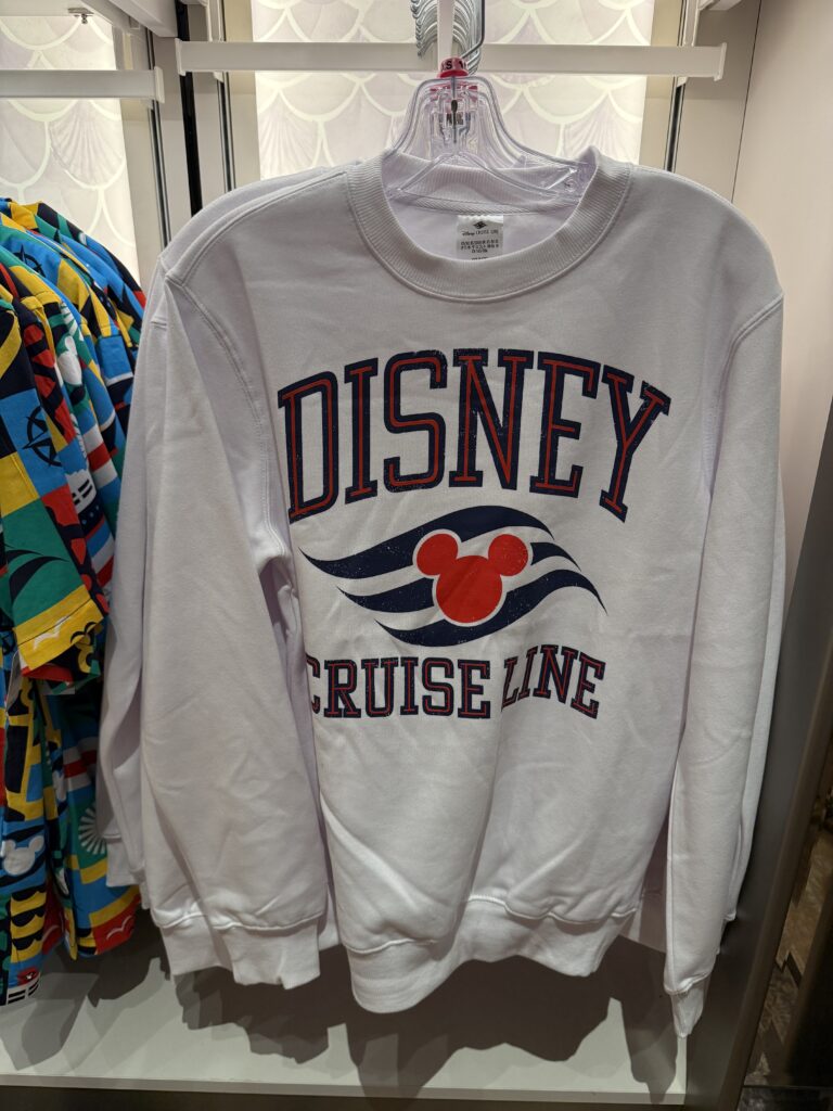There are four different colors for sweatshirts and t-shirts: white, red, green and pink. They all have the Disney Cruise line logo in text as well as the graphic version in classic red, white and blue. Sizes are unisex.
