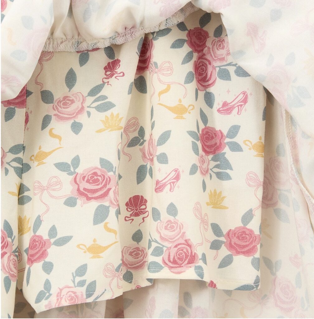 The new long sleeve t-shirt adds a cozy layer to the collection. It comes in a soft neutral tone with a beautiful princess-inspired crest at the center. Floral details and gentle pastel shades keep it feeling light and charming. This top pairs effortlessly with denim, leggings, or the matching ruffled skirt for a coordinated look. Speaking of which, the ruffled skirt may be the most versatile piece of the trio. Its tiered design adds movement and softness with every step. The floral print gives a vintage-inspired feel that’s both classic and modern.