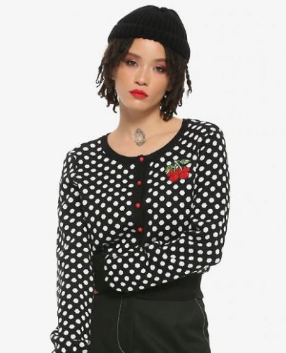 I’m really not sure why this model looks so upset. After all, she is wearing a super cute cardigan! This black and white polka dot cardigan features an embroidered patch of a pair of cherries shaped like Minnie Mouse’s head and bow. Wear with jeans or over a dress for a classic, polka dot inspired look.