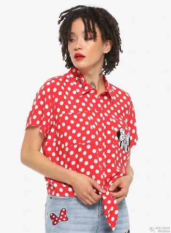HER UNIVERSE DISNEY MINNIE MOUSE POLKA DOTS POCKET TIE-FRONT GIRLS WOVEN BUTTON-UP
