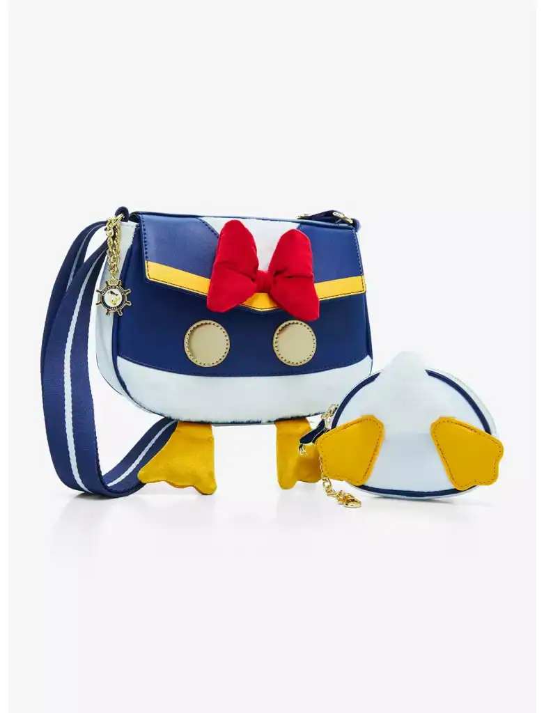 Quack open this crossbody bag to hold all of your Disney Parks essentials! Celebrate the 90th anniversary of your favorite Fab Five member with this bag! Featuring a design inspired by Donald Duck’s outfit, it comes with a plush, velvet bow detailing, fuzzy panels, and 3D duck feet on the bottom. The look is complete with an interior zipper pocket, adjustable strap, snap-button closure and dangling Donald Duck charm.