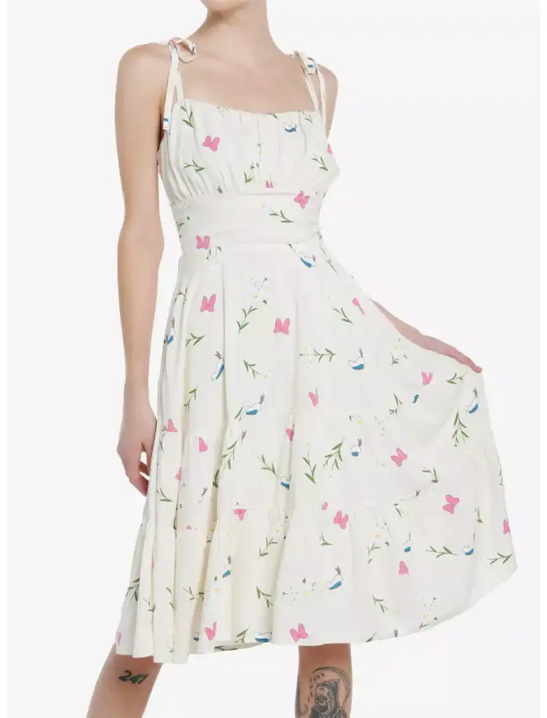 Aw, phooey! We can’t say no to these two lovebirds. Rep your favorite duo with this Disney cami dress, featuring an allover toss of flowers, Donald Duck’s hat, and Daisy Duck’s bow. Comes in a midi length with double tiers, shirring at the bust, an empire waist, and smocking on the back. Self-tie cami straps.