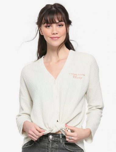 This cream long-sleeve button-up top features a waffle knit texture and pearlescent buttons that just screams “relaxing Disney Princess” to me. This is what the Princesses probably wear when they aren’t in gorgeous ball gowns. To add to the magic of this top, there is “I speak fluent Disney” embroidered text design in rose gold on the left chest with an embroidered outline of Aurora’s crown in rose gold on the back.