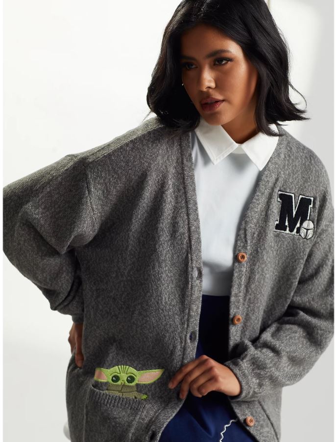 Cardigans are definitely one of my favorite types of clothing. Putting the Mandalorian and Baby Yoda on a cardigan just puts the love over the top for me! The Mandalorian Grey Cardigan has a collegiate style “M” chenille patch with Din Djarin. A Grogu patch peeks out of the pocket!