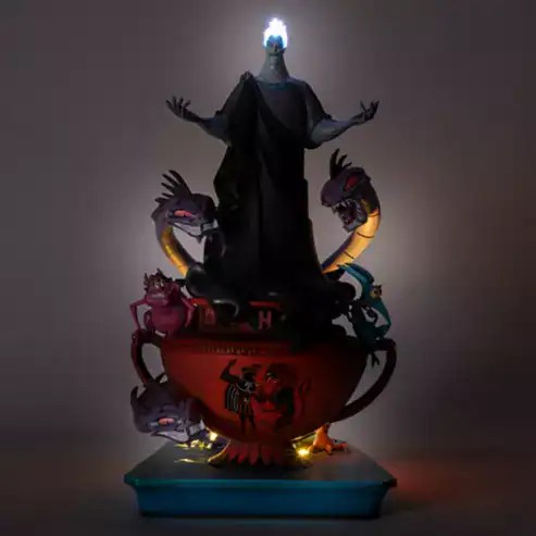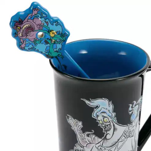 These Hercules-themed collectibles celebrate the delightfully devious Hades in all his underworld glory. The first piece is a dramatic light-up figurine featuring Hades atop a large Greek amphora, surrounded by his monstrous minions. The second item is a black and blue ceramic mug emblazoned with the playful phrase “Underworld’s Best Boss,” accented with blue flames and Hades’ skull emblem. Paired with it is a matching stirring spoon shaped like a jagged flame, featuring colorful art of Hades, Pain, Panic, and the Hydra. Perfect for Disney Villains fans, these items bring humor, mischief, and a touch of the underworld to any collection.