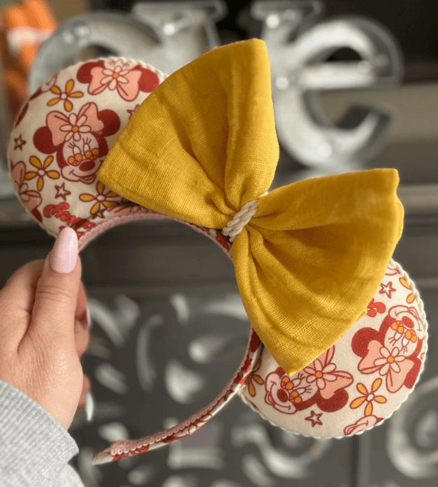 Crafted with a retro-inspired floral fabric in warm hues of maroon, cream, and beige. These ears feature delightful illustrations of Minnie Mouse that evoke a sense of nostalgia and fun. The light pink headband provides a soft, feminine touch, while the mustard yellow bow adds a bold pop of color, tying the entire look together.