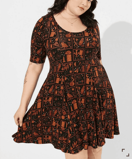 Rock your witchy style when you wear this Hocus Pocus Mini Super Soft Elbow Sleeve Skater Dress. I have a few of these dresses from Torrid in my closet and I can confirm that they really are super soft! Pair this dress with some black tights and black boots for a fall ready look that will take you from office to after-work cocktails.