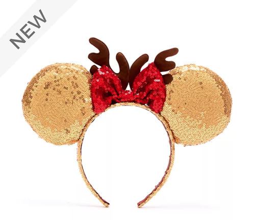 Another new pair we know are coming soon are the Reindeer Minnie ears! These are actually Disney Store ears and some stores have them already! These are “child” ears, but they still tend to fit most adults too! The band is a bit skinnier, and the ears are lighter than the regular ones, but the band actually bends a lot more! They have all over gold sequins with a red sequined bow. The finishing touch of course is the antlers on top! Plus being the child-size ears, they are also a lot cheaper than the regular ears too!
