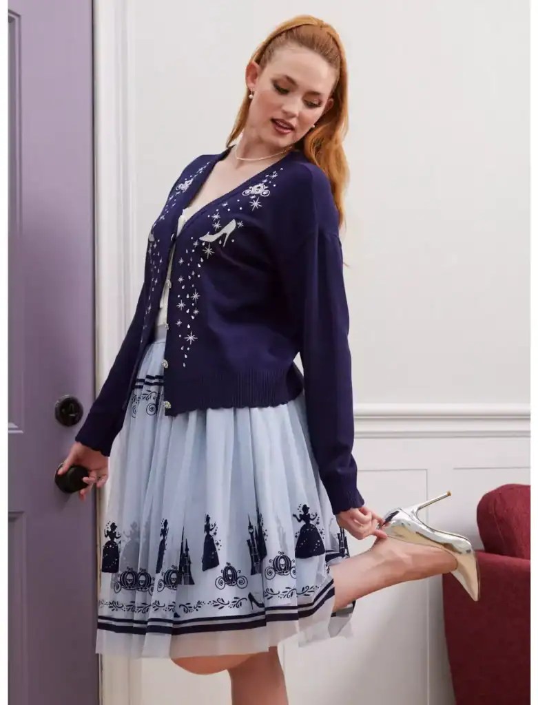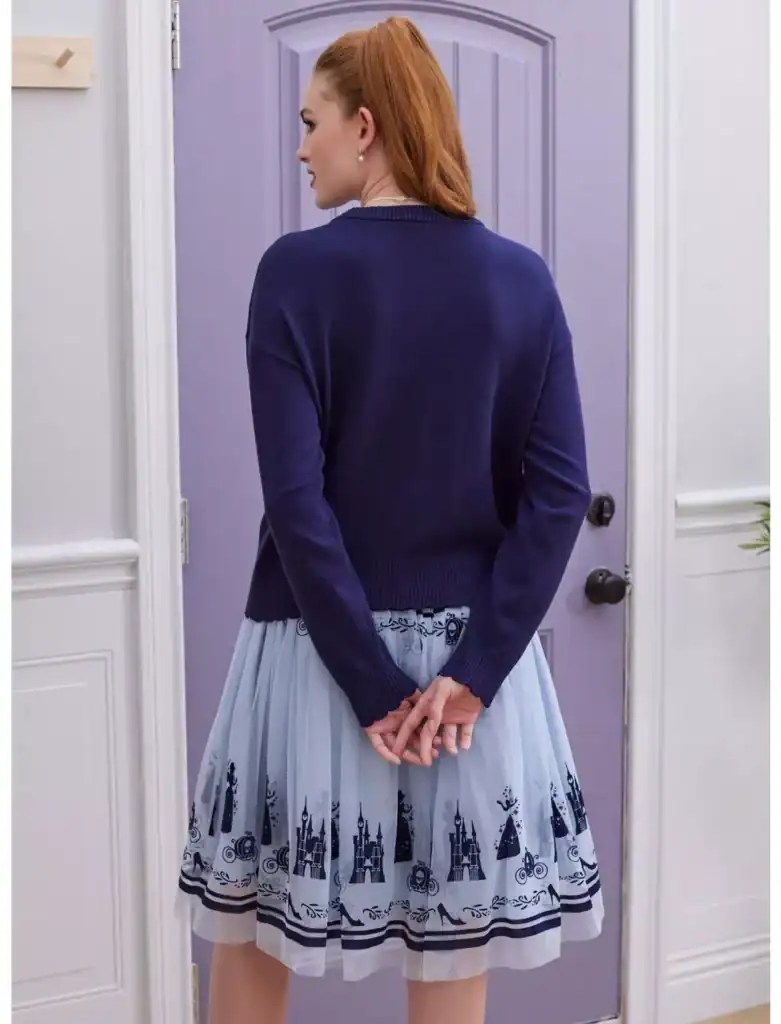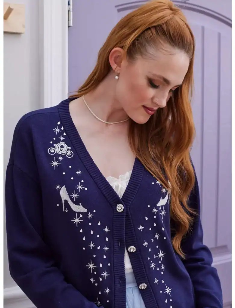 Heading out to the ball? Don’t forget your glass slippers and this cozy cardigan! Look like royalty in this Cinderella cardi, featuring silver embroidery of Cinderella’s glass slippers and her carriage, plus dainty knit sparkles and rhinestone gems throughout. Complete with ornate buttons down the center.