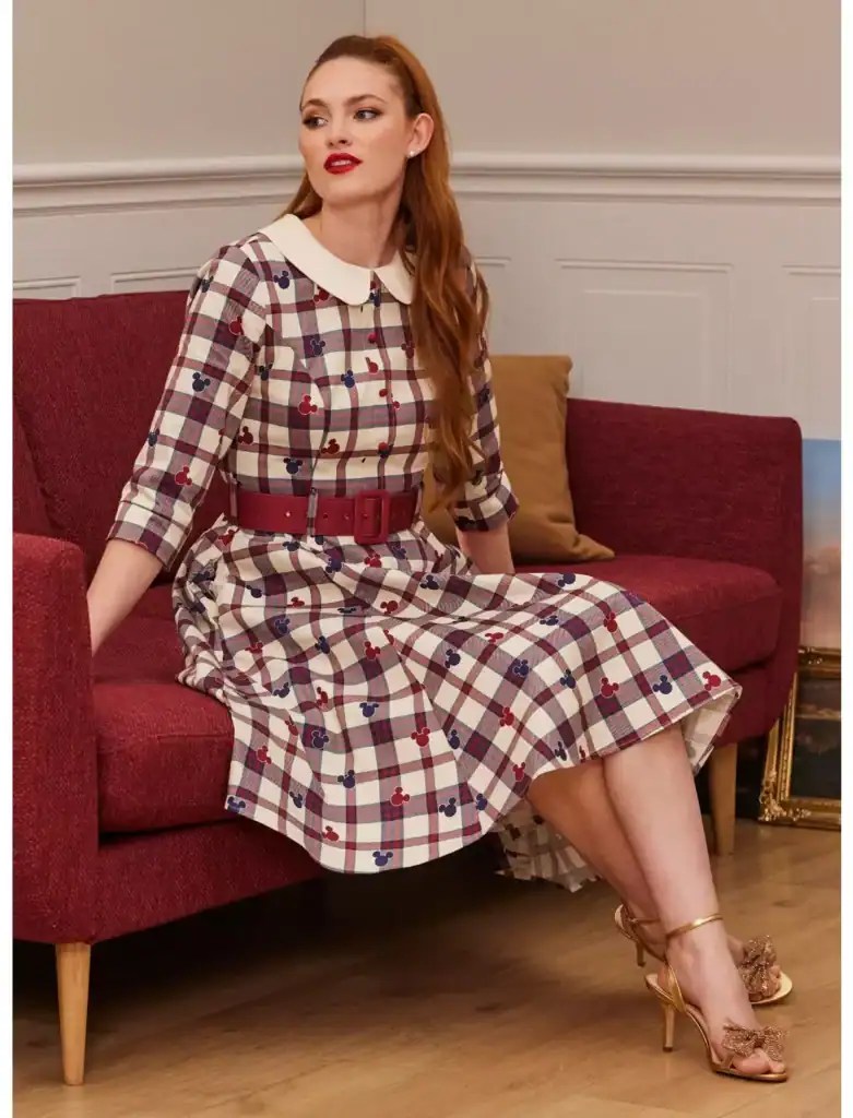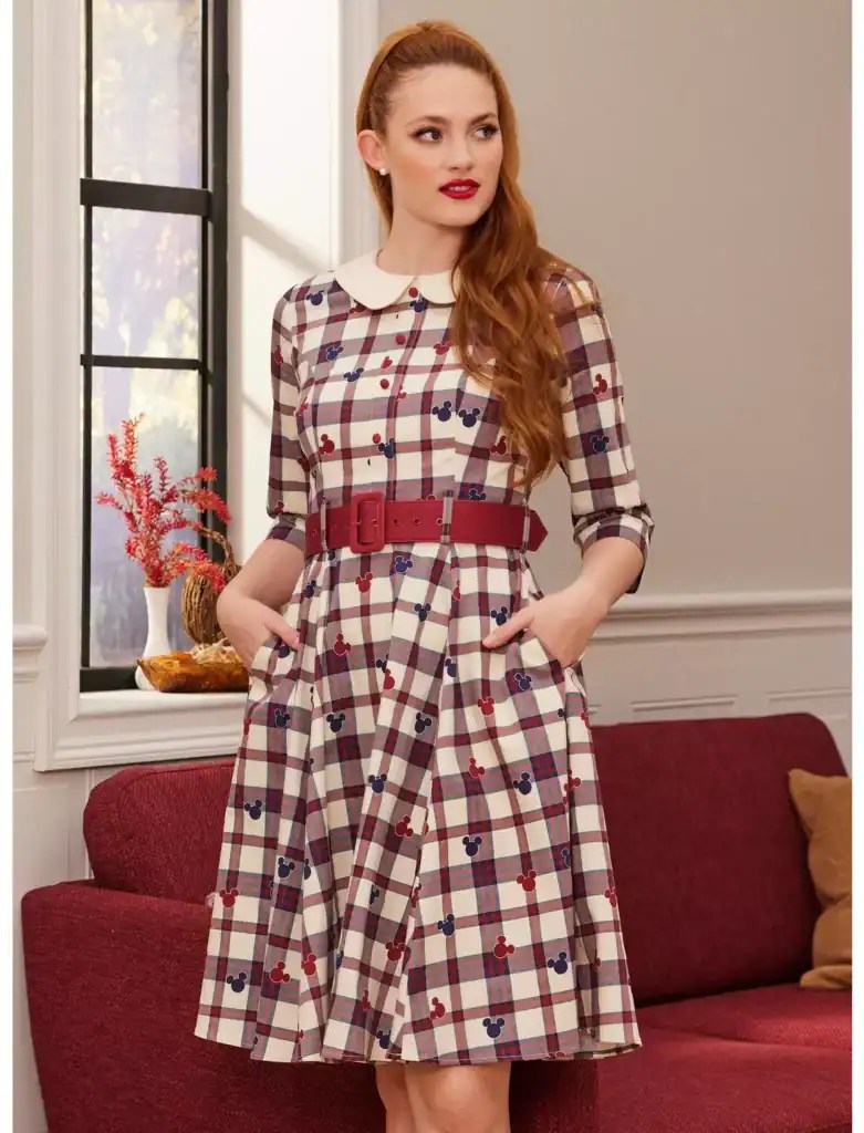 Add some Disney magic to your retro wardrobe! This plaid dress features maroon and navy Mickey Mouse heads all over the matching plaid pattern, plus a removable maroon belt at the waist. Comes with flattering princess seams, decorative buttons down the bust and a retro collar.