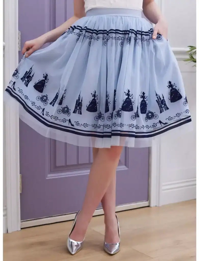 Twirl around in this beautiful Cinderella skirt before the clock strikes midnight! It features a dreamy tulle layer over an ice blue body, with deep blue flocked artwork of Cinderella, her castle, her carriage and other filigree bordering around the skirt.