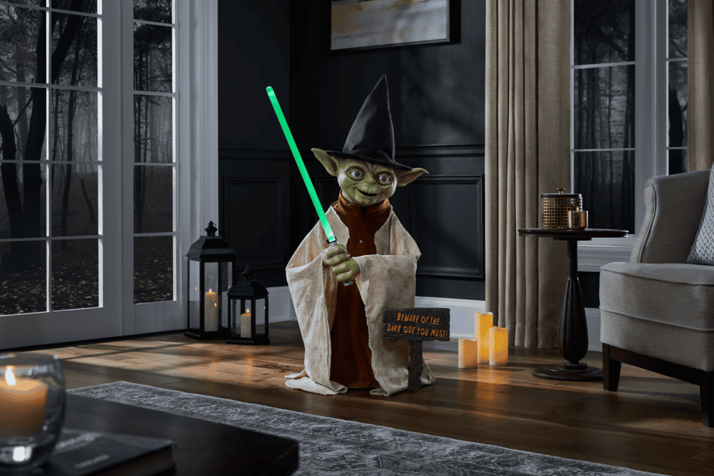 Help you with your holiday decor, Yoda will. With lifelike servo motor head movement and a moving mouth, it looks as though the real Yoda is standing before you. His glowing LED lightsaber lights up and moves from side to side. with sensor activation, neighbors will find Yoda talking with them when they get close. Yoda comes with Halloween and Christmas outfits, so this décor piece is a perfect way to brighten your Halloween or Christmas for the Star Wars fans in your family ($199.00).