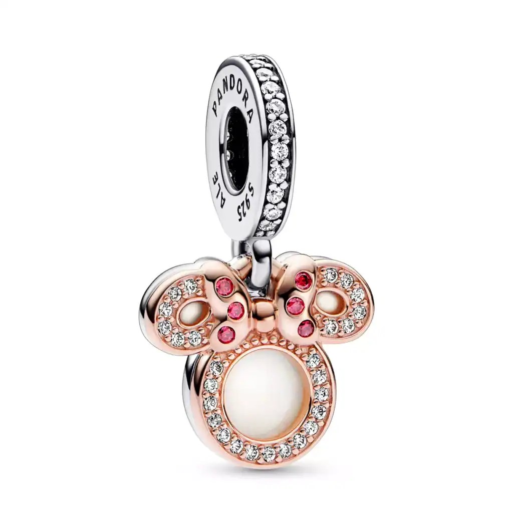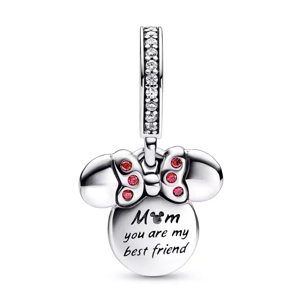 La marca Pandora nos trae este increíble dije colgante con la silueta de Minnie Mouse cristales en tonos rojos para el moño y un baño de oro rosa para la cara frontal mientras el reverso en tono plateado dice “Mom you are my best friend” (Mamá tu eres mi mejor amiga) o estos otros dos dijes deslizables también donde vemos la palabra “Mom”(Mamá) con un corazón en lugar de la letra O y un moño rojo de esmalte que claramente nos evoca a Minnie Mouse.