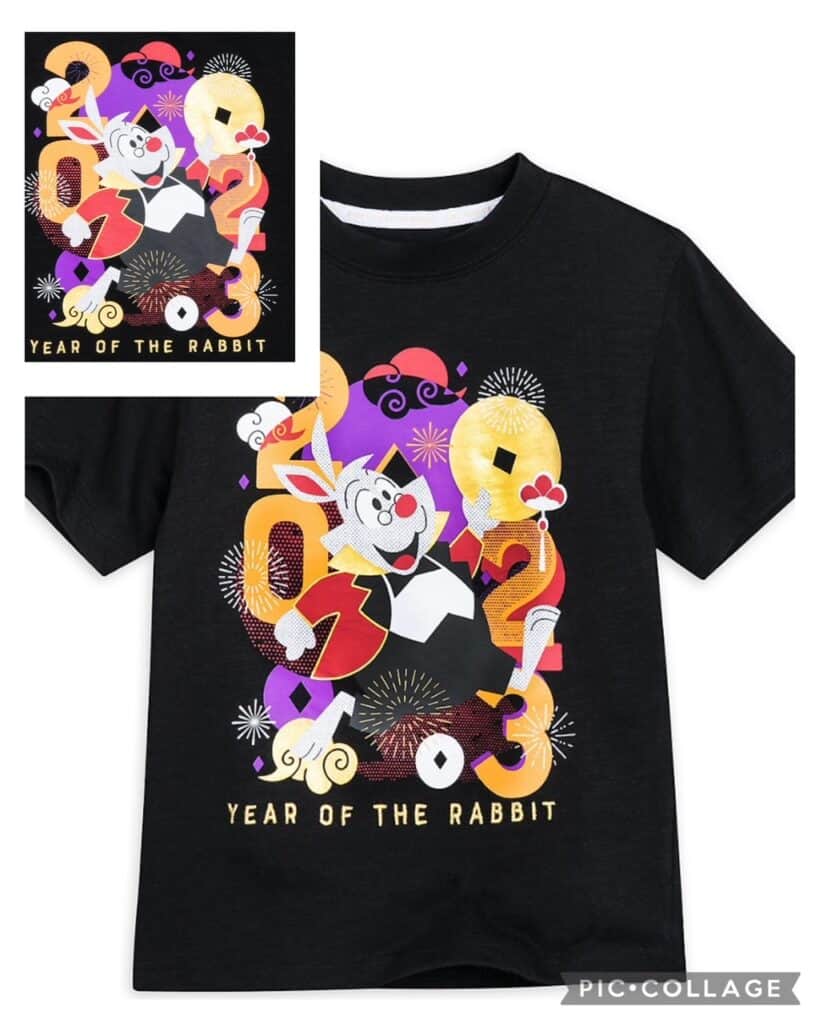 The Lunar New Year collection features two adult shirts. Thumper hops into the collection on a long sleeve tee, while the White Rabbit and Mad Hatter Decorate the short sleeve. Both T-shirts are decorated with bright colors, fireworks, and 2023.