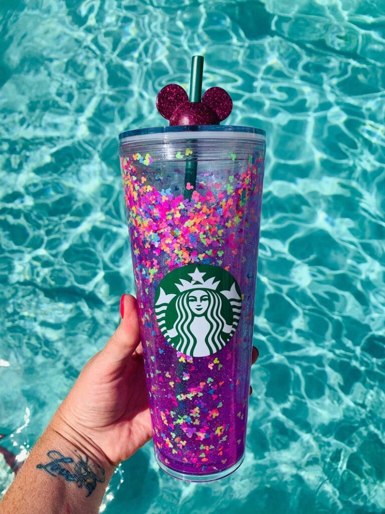 This cup features iridescent Mickey and white glitter between the two tumbler walls. Includes clear lid, and green straw, and glittering straw topper.