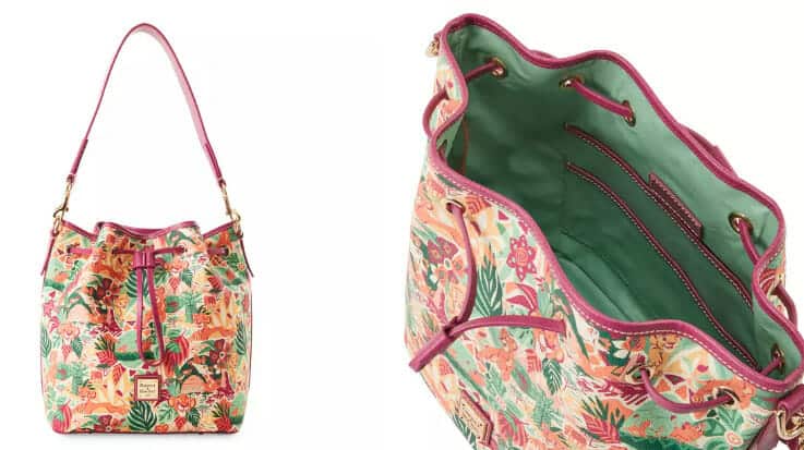 We’ve been seeing a lot of this drawstring bag in recent collections. I’m too paranoid for this bag because I like the security of a zipper. I do love the shape of the bag though! The pictures from shopDisney for this silhouette do show the lining, however! A stunning green lining that is the perfect complement to the foliage within the pattern!