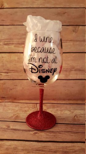 But I would sure like to cheer myself up with a little splash of red or white in this glass, wouldn’t you? This custom wine glass features a full 360 degree design. The front of the glass reads “I wine because I’m not at Disney” while the back of the glass includes scattered Mickey Mouse heads.