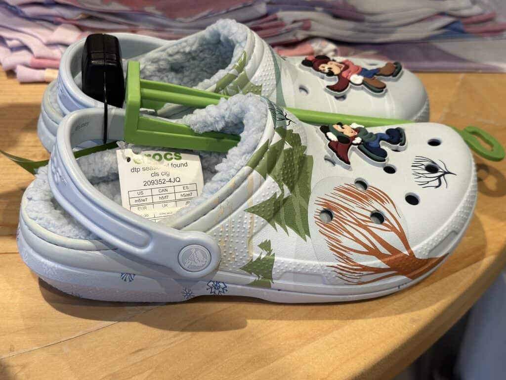 A newly designed Disney Croc arrived at Disney Springs. These winter themed crocs are perfect for the colder climates…or those whose feet are perpetually cold. Fleece lined Crocs provide a toasty option. The clogs are light in color with a winterscape designed upon it. Join Donald, Mickey, and Minnie at the ice-skating pond for some cold weather fun. Then again, based on Donald’s inert position on his back, he might not be having a jolly time!