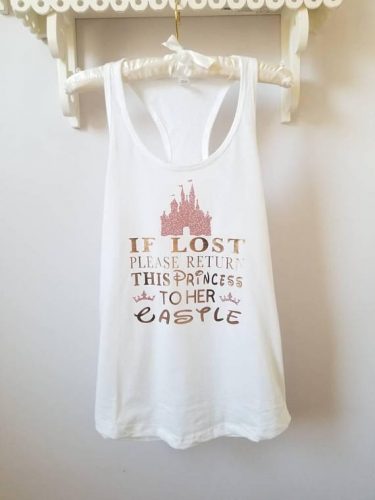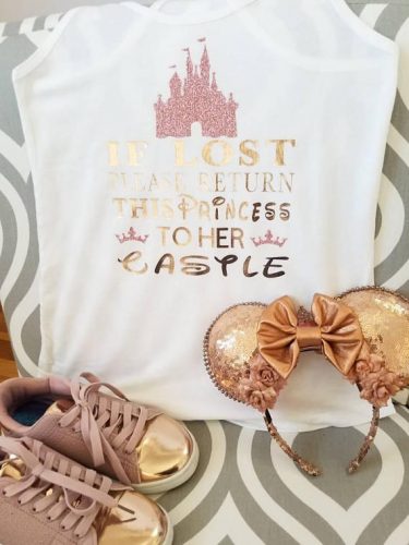 How perfect is this tank top? I just love the rose gold castle paired with the words “If Lost Please Return This Princess To Her Castle.” But really, even if you just see me walking down the street – return me immediately to Cinderella Castle! At first, this design seems pretty simple, but there are actually some pretty great details included. The top of the tank top’s design features a glittery rose gold castle. By putting the castle front and center, you already know this shirt was made for a Princess. There are also two Princess tiaras in the design that feature the same glittery rose gold for that extra touch of sparkle.