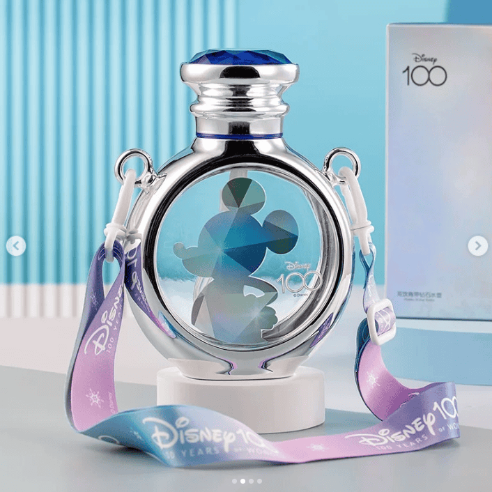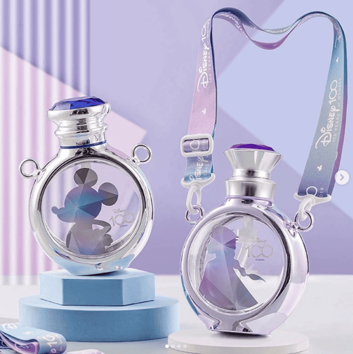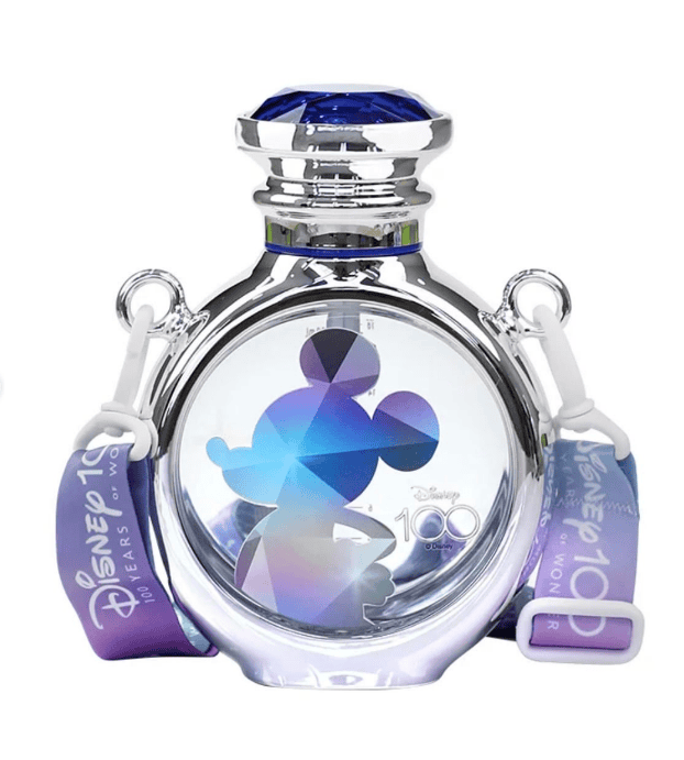 First, these gorgeous and sparkling Disney 100 Water Bottles with straps are fabulous. Here, we can see two different options: Mickey Mouse and Elsa. I love that these water bottles look just like perfume bottles, but the prettiest perfume bottles I’ve ever seen. Just look at those gem tops!