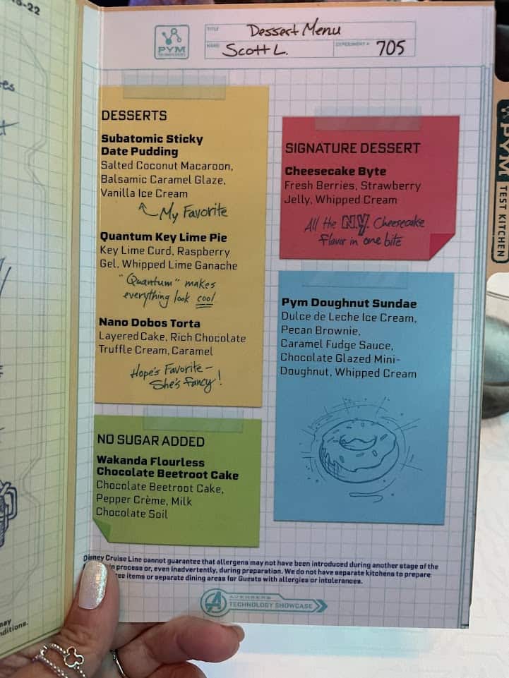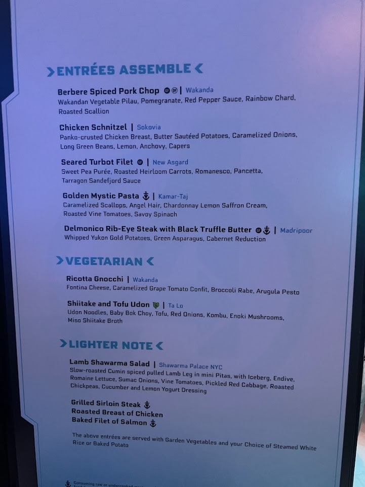 On our first night, we stepped into the World of Marvel for a superhero-themed adventure! Ant-Man and Wasp lead Guests through their meal with surprising and hilarious antics. When things go inevitably wrong, they are joined by several other Marvel heroes to save the ship (and dinner)! This interactive dining experience was more than just dinner theater. It made us really feel a part of the story.