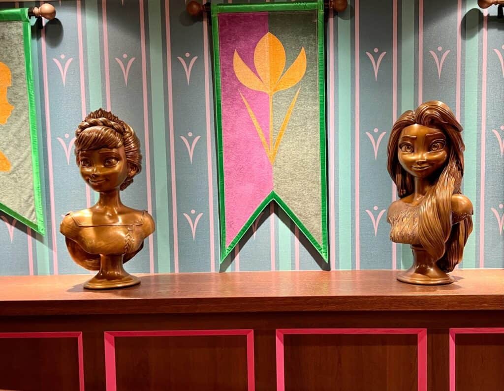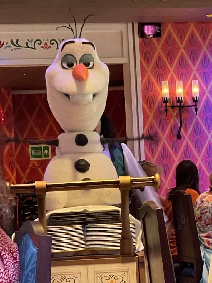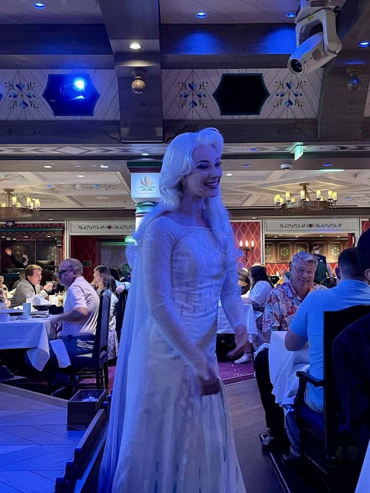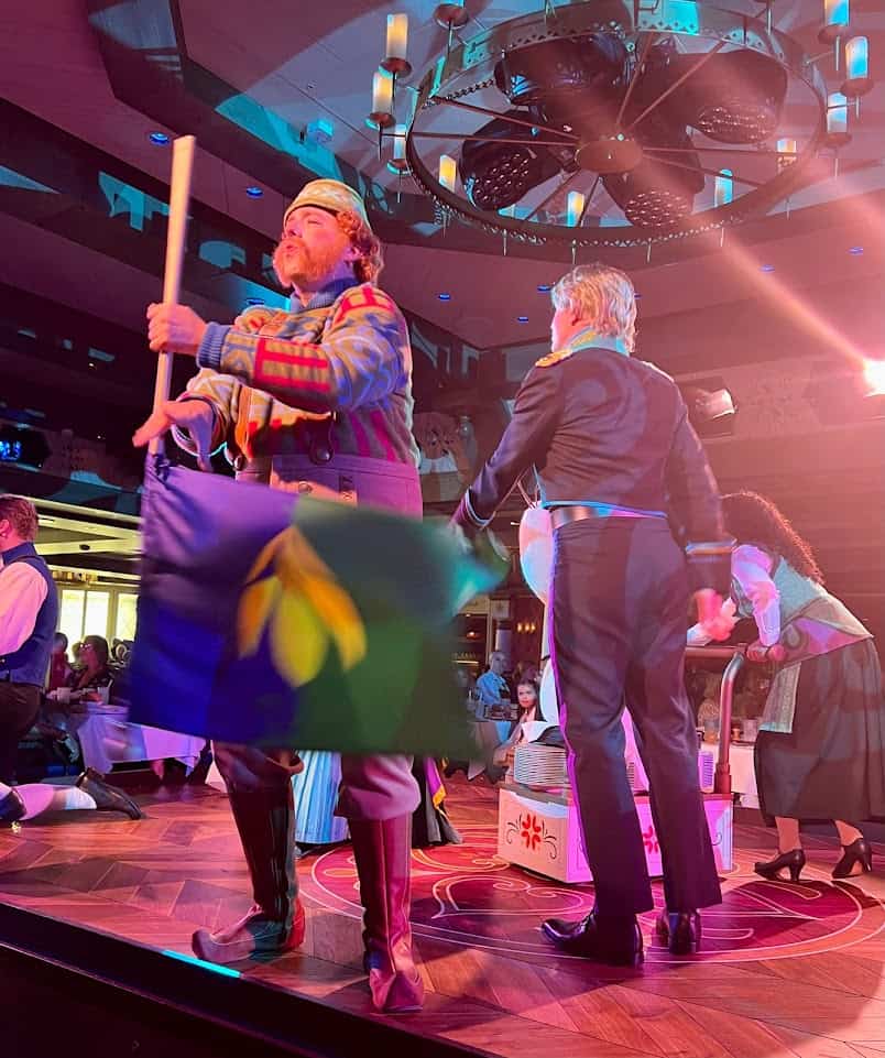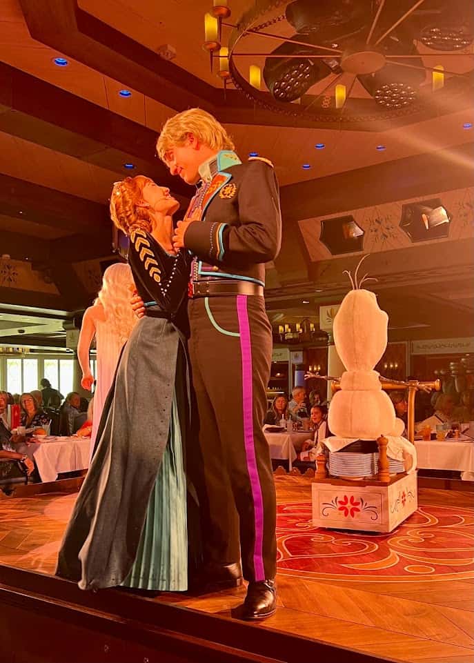 On our second night, Guests were invited to attend the engagement party for Princess Anna and Kristoff. Since this was an official Arendelle event, it was also attended by Queen Elsa, Olaf, Oaken, and traveling minstrels. Again, the theming of this restaurant was absolutely amazing! Walking into the restaurant is like walking into the castle of Arendelle. Portraits of the royal family line the walls, frozen portholes allow you to rest after you have stuffed way too much chocolate in your face, and embroidered napkins add regal style.