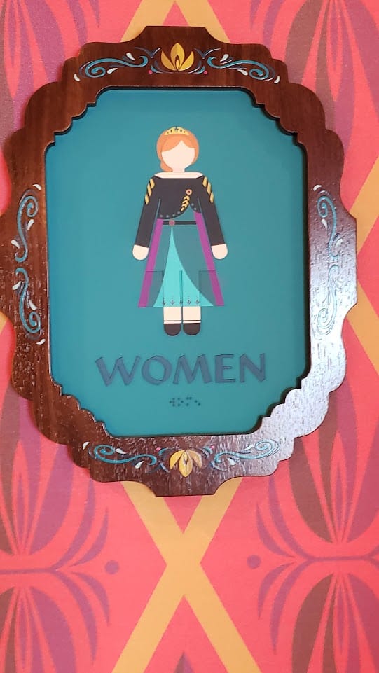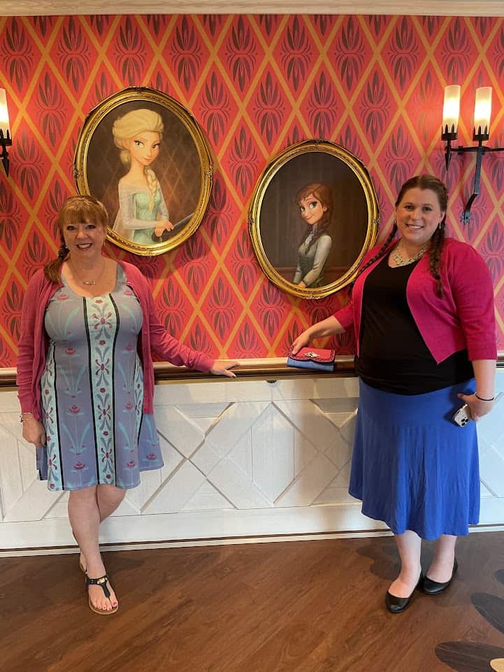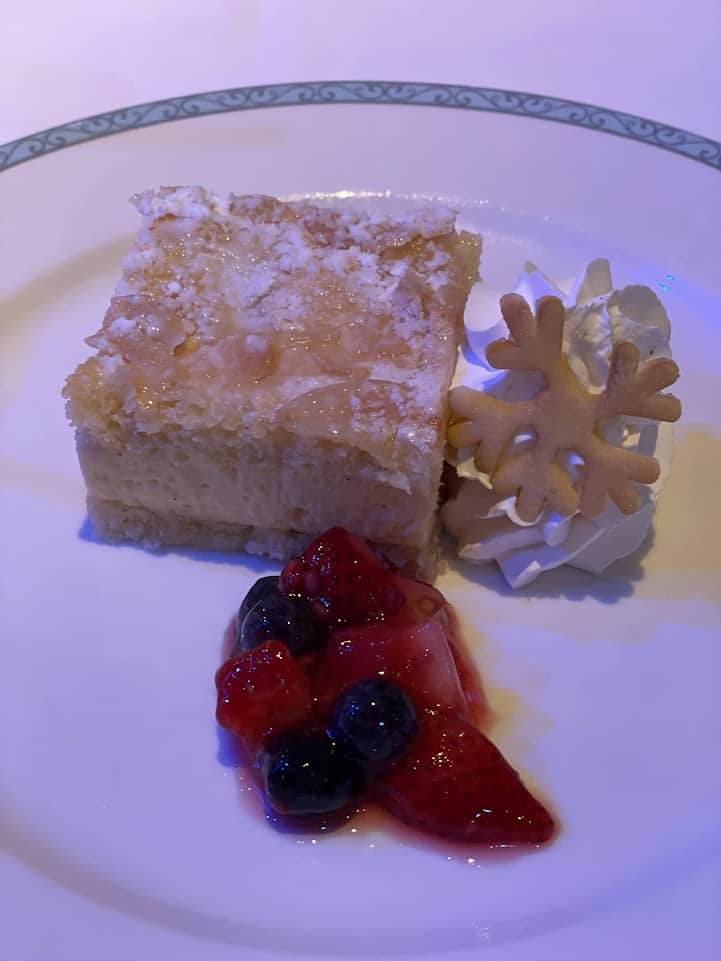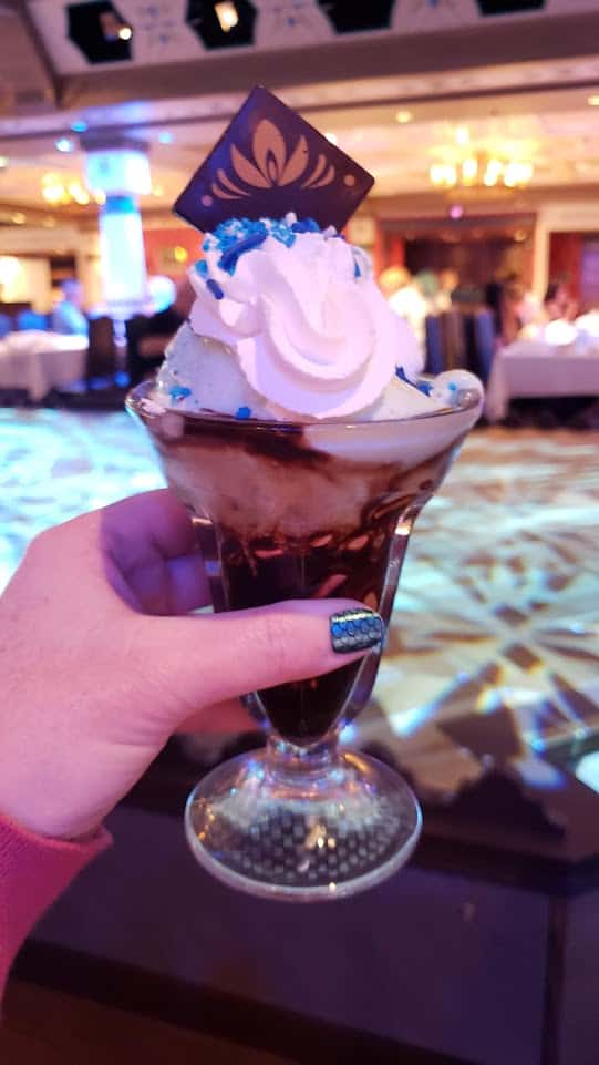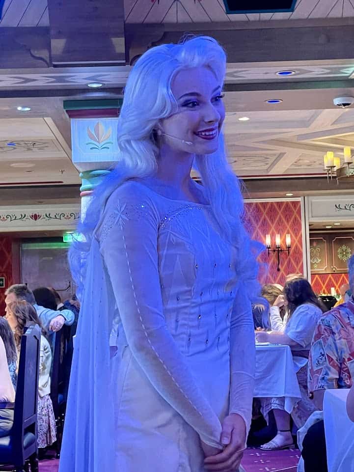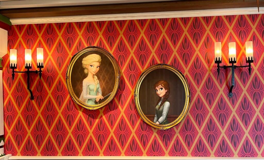 On our second night, Guests were invited to attend the engagement party for Princess Anna and Kristoff. Since this was an official Arendelle event, it was also attended by Queen Elsa, Olaf, Oaken, and traveling minstrels. Again, the theming of this restaurant was absolutely amazing! Walking into the restaurant is like walking into the castle of Arendelle. Portraits of the royal family line the walls, frozen portholes allow you to rest after you have stuffed way too much chocolate in your face, and embroidered napkins add regal style.