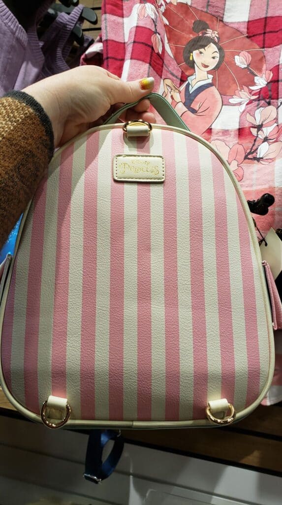 The first item in the set is a Mini Backpack. The front of the bag has tea cups that represent Cinderella, Snow White, Jasmine, Ariel, Tiana, and even Mulan! I find it hilarious that some of the friends of each of the Princesses are playing in the tea. Flounder has just jumped right into the Ariel cup! Hopefully, her tea wasn’t very hot. Cri-Kee has also gone in for a swim.
