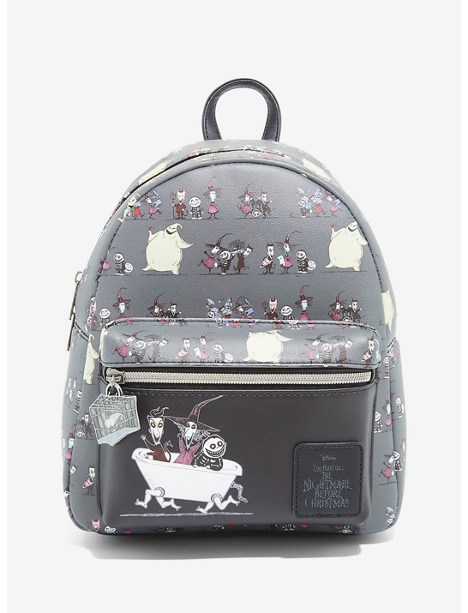 The final mini backpack is the Oogie’s Boys Mini Backpack. Lock, Shock and Barrel ride in their bathtub on the front pocket. In the background you see Oogie Boogie leading the way as his evil henchmen take part in several Halloween treats. From wearing masks to trying to steal things, it’s clear that these boys are up to no good!