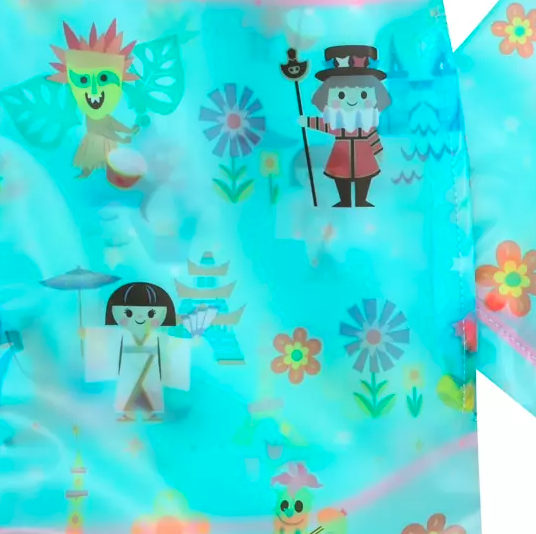The it’s a small world rain jacket is a lovely shade of blue and features our favorite dolls from around the world. The thing to remember with both of these rain jackets is that they are translucent. So, while wearing this pattern, you may want to consider what you are wearing underneath. That’s just the fashionista in me talking. These are the things I think about. I clearly have issues.
