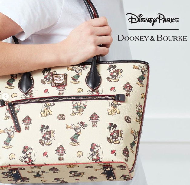 This bag looks to come in at least 2 different silhouettes. It also features Mickey, Minnie, Donald, Goofy, and Pluto (so the Fab 5) performing different activities or wearing different traditional German attire! I’m loving the cuckoo clocks and pretzels thrown into the pattern. So cute!
