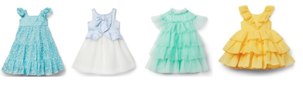 The Disney Princess Collection by Janie and Jack features limited-edition pieces inspired by iconic princesses Cinderella, Belle, Tiana, and Ariel. It includes whimsical dresses with cascading ruffles and voluminous tulle under layers – perfect for twirling – with matching accessories like tiaras, wands, and gloves to complete the looks.